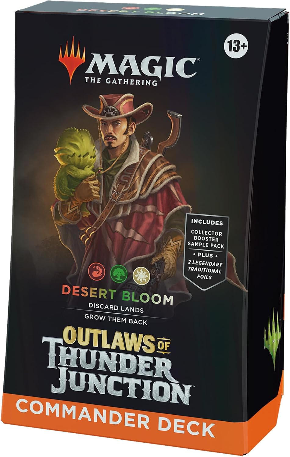 CONTENIDO: 1 mazo de Commander de Forajidos de Cruce de Truenos, Desierto floreciente, listo para jugar, un sobre de coleccionista con 2 cartas de muestra grabado especial, 10 fichas de dos caras, 1 contador de vidas y 1 caja guardamazo.